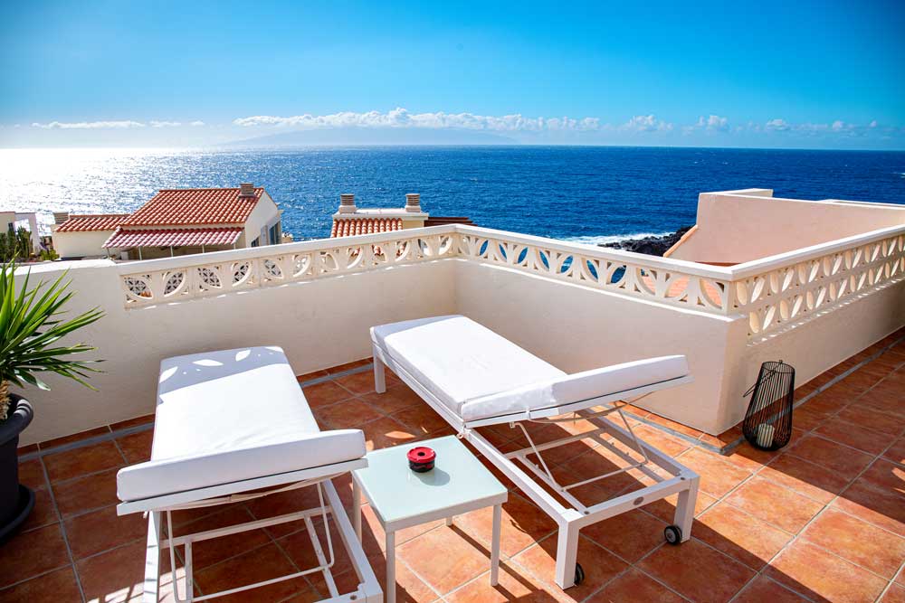 Die vollkommen neu renovierte Dachterrassen-Wohnung (inklusive WLAN) bietet auf 78m² Wohnfläche bis zu 4 Personen Platz und lässt keine Wünsche offen. Sie verfügt über 2 Schlafzimmer, eine moderne, komplett ausgestattete Küche mit hellem, gemütlichem Wohnraum und 2 Bäder, die schon beim Aufstehen jeden Tag zu etwas Besonderem machen. Vom Master Schlafzimmer aus gelangen Sie auf einen 18m²-Balkon, wo Sie den Blick auf den Ozean und auf den ruhigen Garten genießen können. Als absolutes Highlight aber erwartet Sie die Dachterrasse. Ganz eingetaucht in südländischen Terracotta-Charme und das Grün üppiger Topfpflanzen, können Sie sich dort vom endlos weiten Blick auf den Atlantik und auf La Gomera überwältigen lassen. Entspannung bietet neben gemütlichen Loungemöbeln nicht zuletzt das 4x4m große Day Bed. Da die 65m² große Terrasse auch teilweise überdacht ist, verspricht sie zudem Romantik bei jedem Wetter. Zusätzlich lädt Sie ein Weber Grill ein, Ihre Abende stilecht sanft mit selbst zubereiteten Gaumenfreuden ausklingen zu lassen.